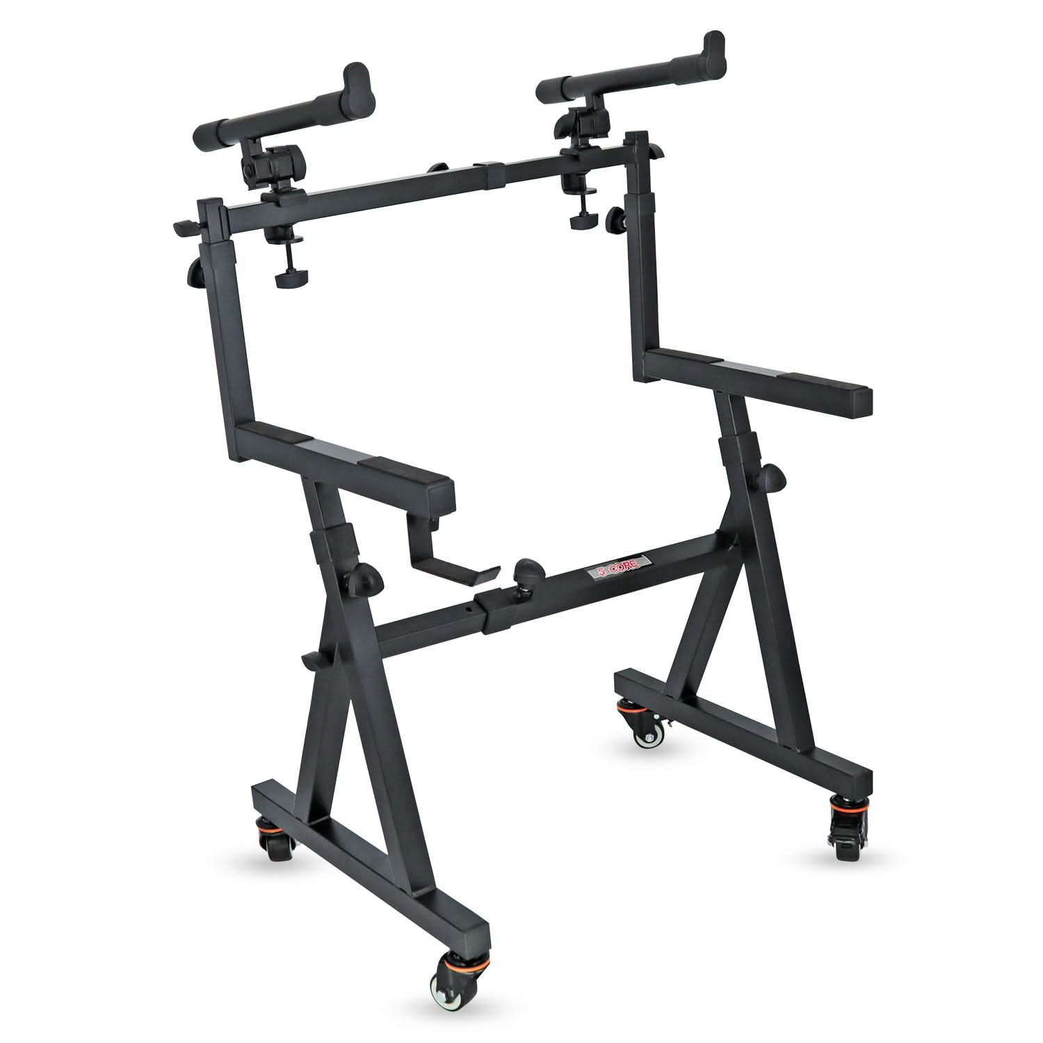 Upgrade your music experience with our professional two tier keyboard stand. Made from durable metal with reinforced joints, this keyboard riser supports up to 250 lbs, ensuring your instruments are safe. The removable second tier adjusts in 10 degree tilting increments and height from 5 to 12 inches, accommodating all your keyboard needs. Its Z frame design and secure lock on wheels keep the digital piano stand stable. It is quick to assemble, and no special tools are required. Perfect for digital pianos, synths, and DJ mixers, this piano stand for 88 keyboards also features a convenient headphone holder. When not in use, it disassembles compactly for easy storage and transport. Enhance your audio setup with this reliable keyboard accessory. |